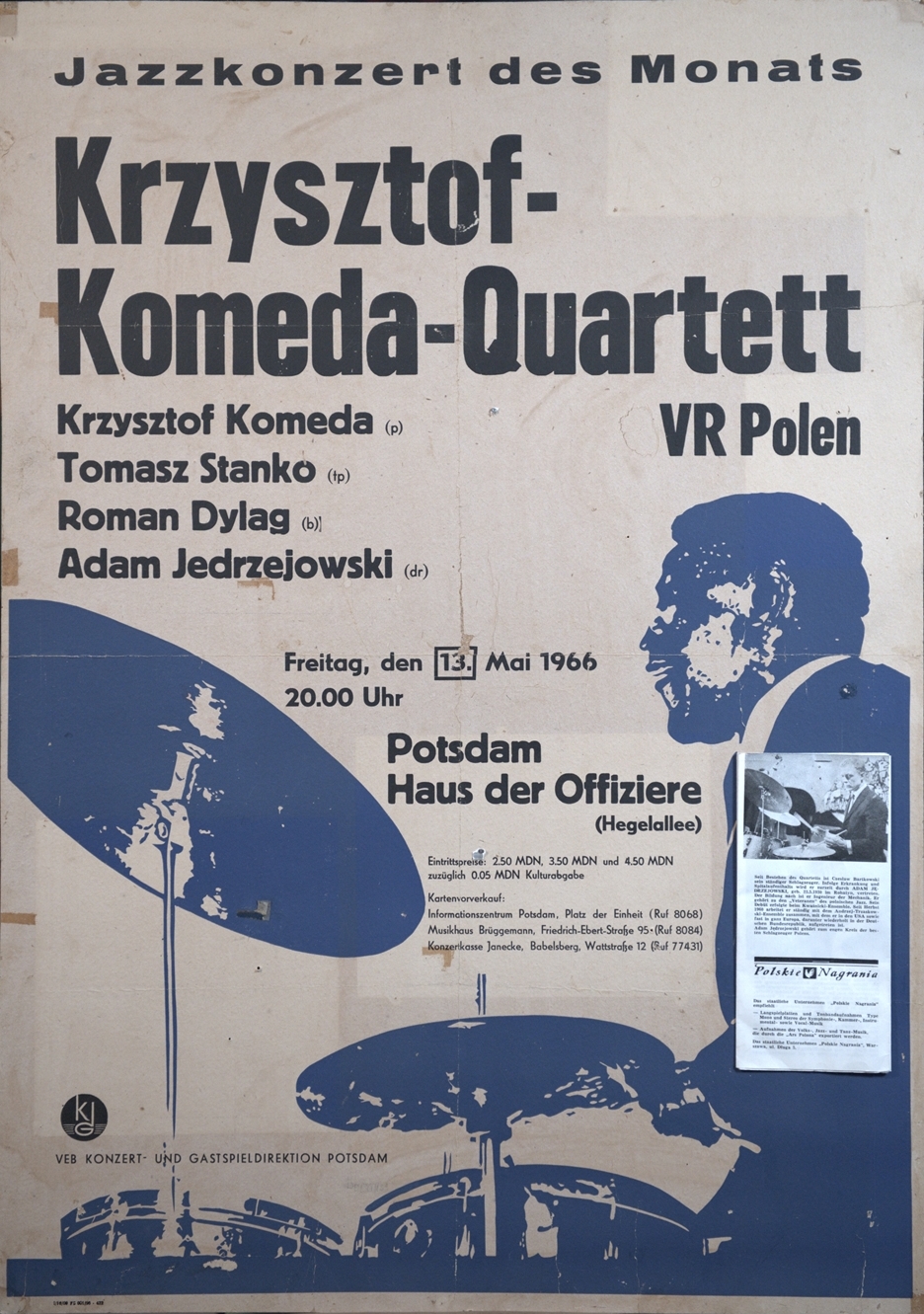 ![Plakat koncertowy. Druk na papierze. Poczdam – Niemcy, rok tysiąc dziewięćset sześćdziesiąty szósty. Wymiary sześćdziesiąt jeden na osiemdziesiąt sześć centymetrów. Od góry plakatu napisy: Jazzkonzert [Dżezkoncert ] des Monats. Pod spodem Krzysztof Komeda Quartett. Krzysztof Komeda, Tomasz Stańko, Roman Dyląg, Adam Jędrzejowski. Pod naposami monochromatyczny niebieskawy nadruk sylwetki mężczyzny siedzącego przy zestawie perkusyjnym. Z prawej strony plakatu wycięty fragment artykułu prasowego ze zdjęciem Adama Jarzębowskiego.](https://szlakikultury.ariari.org/wp-content/uploads/2024/12/DSC_2617-150x150.jpg)