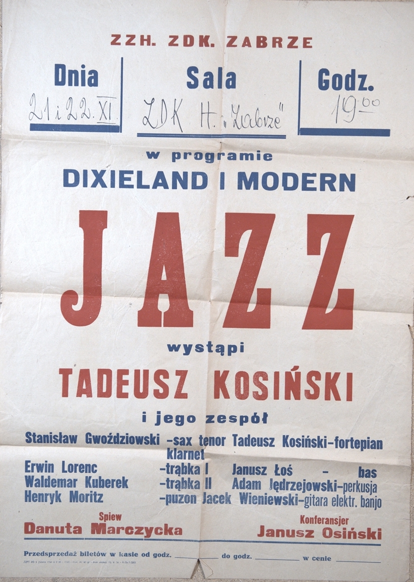 Audiodeskrypcja: Fotografia, Koncert Dom Kultury Zabrze. Autor: Władysław Dziczyński. Materiał: papier fotograficzny. Miejsce wykonania: Dom Kultury Zabrze, rok tysiąc dziewięćset pięćdziesiąty szósty. Wymiary: dwadzieścia pięć na dwadzieścia centymetrów. Czarno-biała fotografia w białym passe-partout. Na fotografii, po lewej stronie: Adam Jędrzejowski, siedzi przy instrumentach perkusyjnych, w dłoniach trzyma pałeczki. Ma na sobie białą koszulę z długimi rękawami i czarne spodnie. Po prawej stronie, na drugim planie, odwrócony plecami przy fortepianie siedzi Tadeusz Erol Kosiński. Pod fotografią na passe-partout napisy. Z lewej: Adam Jędrzejowski – perkusista jazzowy, po prawej: Władysław Dziurzycki. Pod spodem logo stulecia Zabrza (Remigiusz Koziński, Fundacja Otwieramy Kulturę i Sztukę).